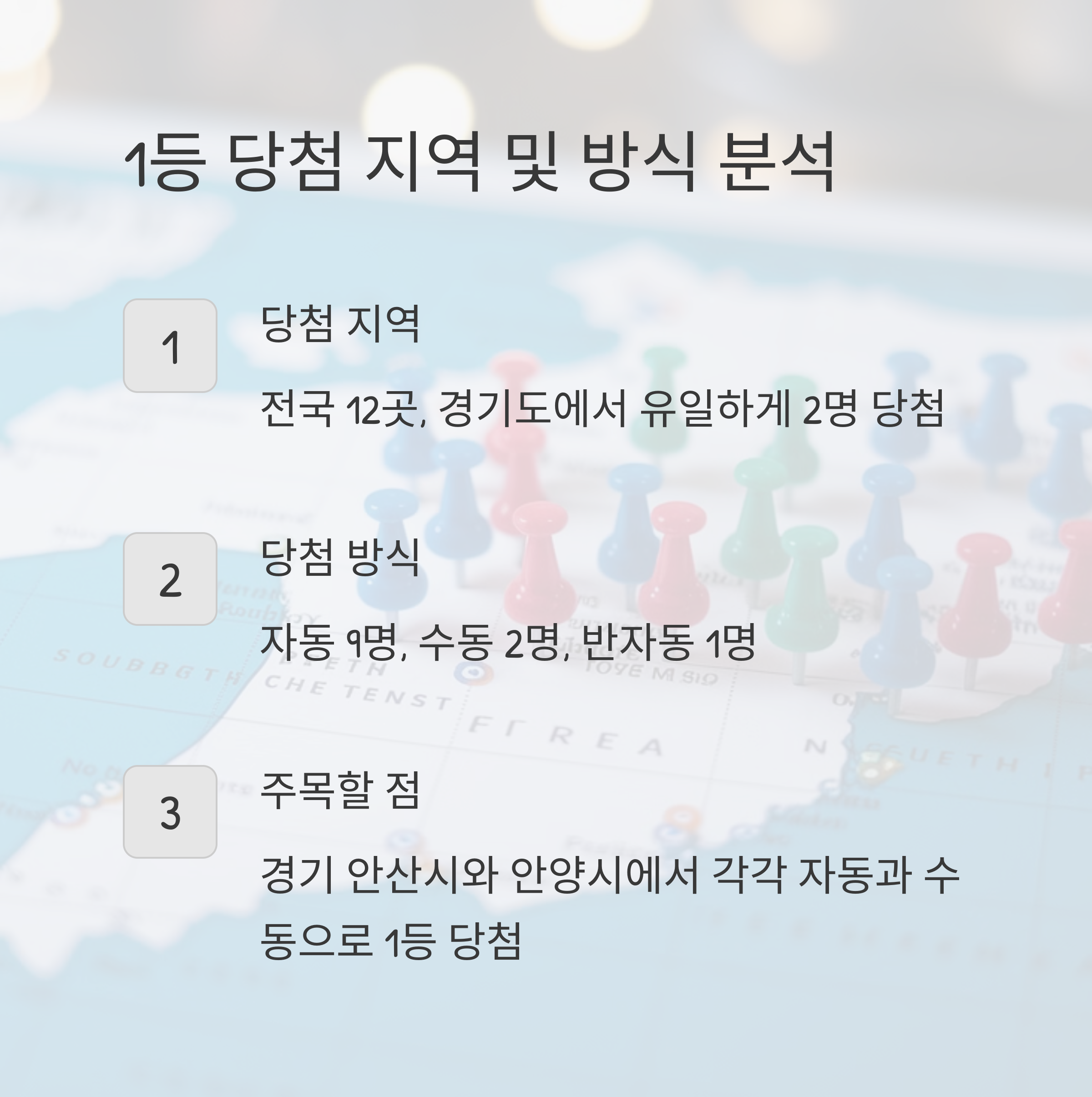 더욱 흥미로운 점은 1등 당첨 방식의 분포입니다. 자동 선택이 9명으로 가장 많았고, 수동 2명, 반자동 1명으로 나타났는데요. 이는 전체 로또 선택 방식에서 자동의 비중이 높다는 것을 보여주는 동시에, 수동과 반자동으로도 충분히 1등에 당첨될 수 있다는 희망을 보여주네요.