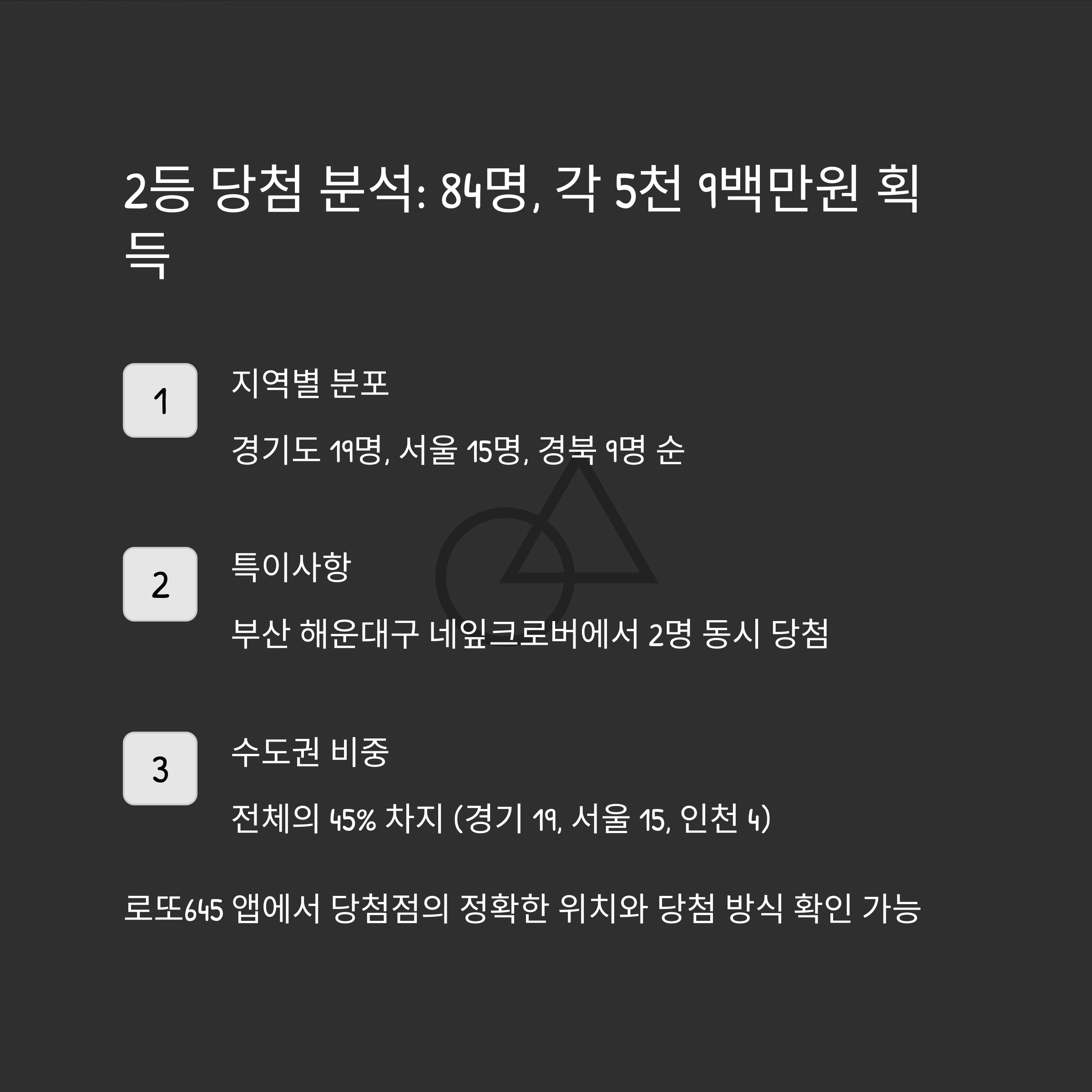 1160회 로또 2등은 총 84명이 당첨되어 1인당 5천 9백만원의 당첨금을 받았습니다. 지역별 당첨자 분포를 보면 수도권이 전체의 45%를 차지했는데, 경기도 19명, 서울 15명, 인천 4명이 당첨되었네요.