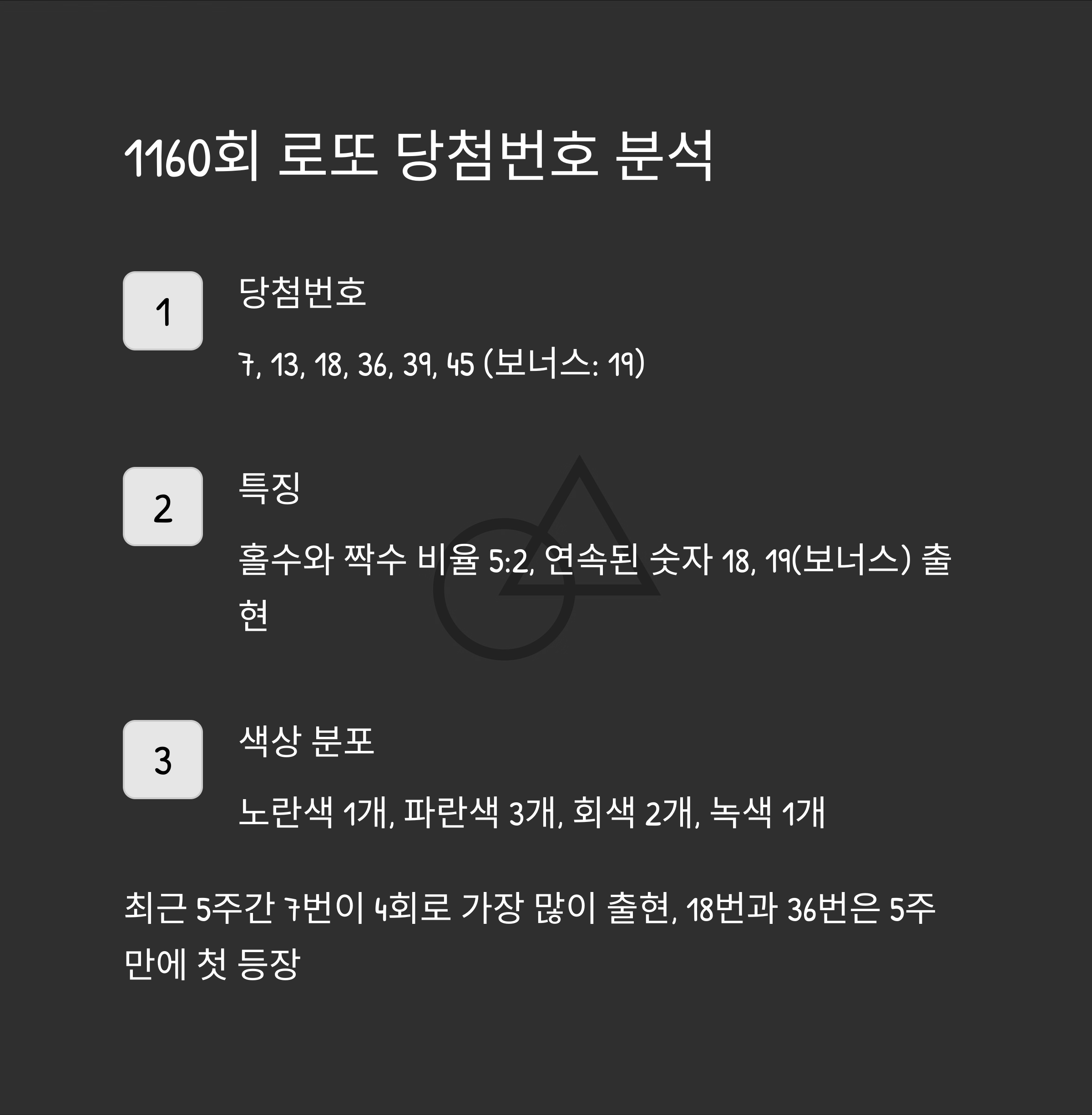 1160회 당첨번호는 7, 13, 18, 36, 39, 45와 보너스 번호 19입니다. 홀수와 짝수 비율은 5:2로 홀수가 많이 나왔네요.