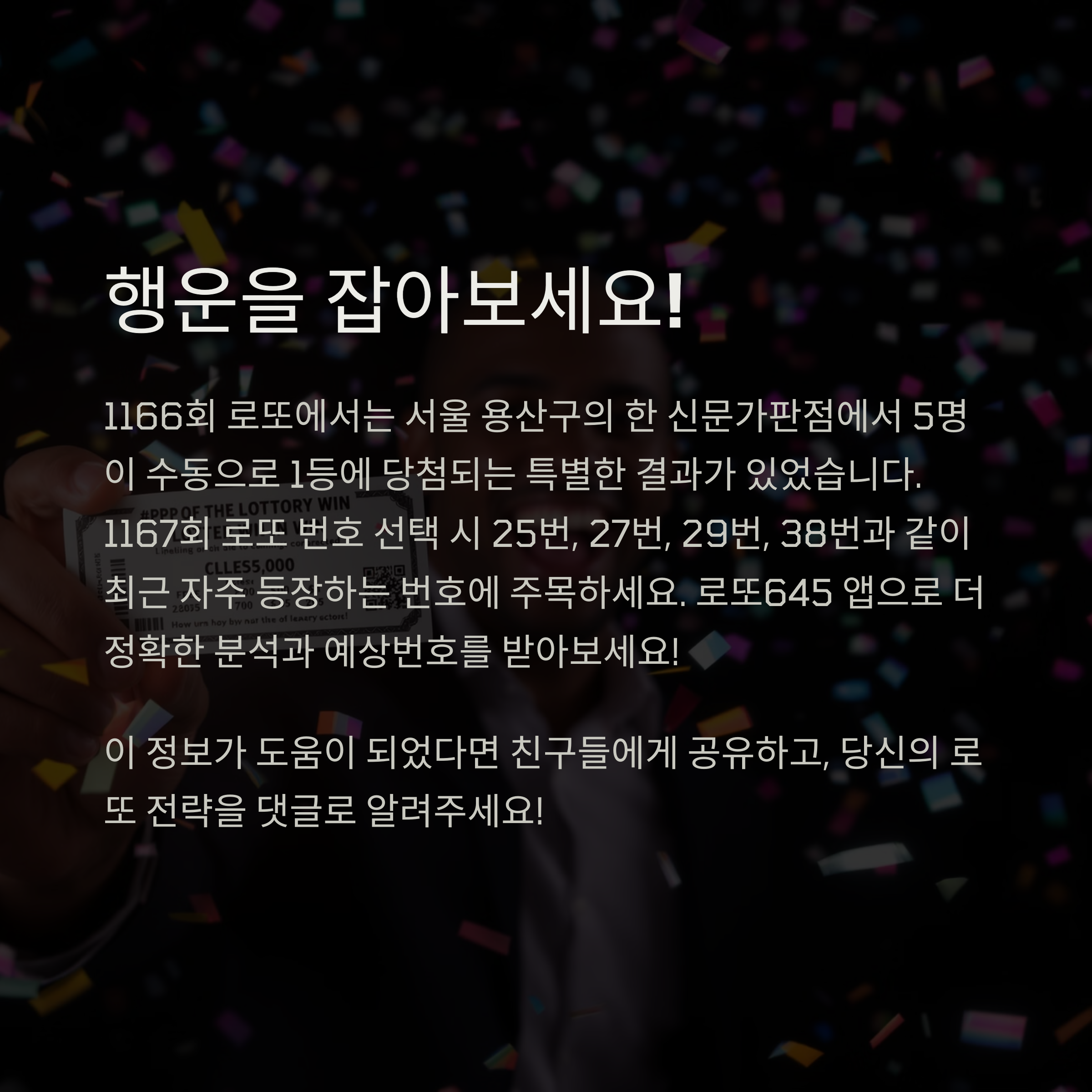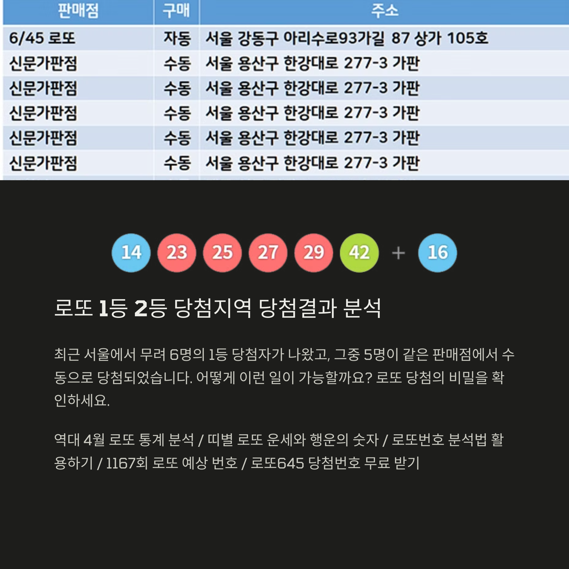 지금까지 1166회 로또 당첨결과와 1167회 로또 예상번호에 대해 알아보았습니다. 1등 당첨자 14명 중 서울에서 6명이 당첨되었고, 특히 서울 용산구의 한 신문가판점에서 무려 5명이 수동으로 당첨된 특별한 결과가 있었습니다.