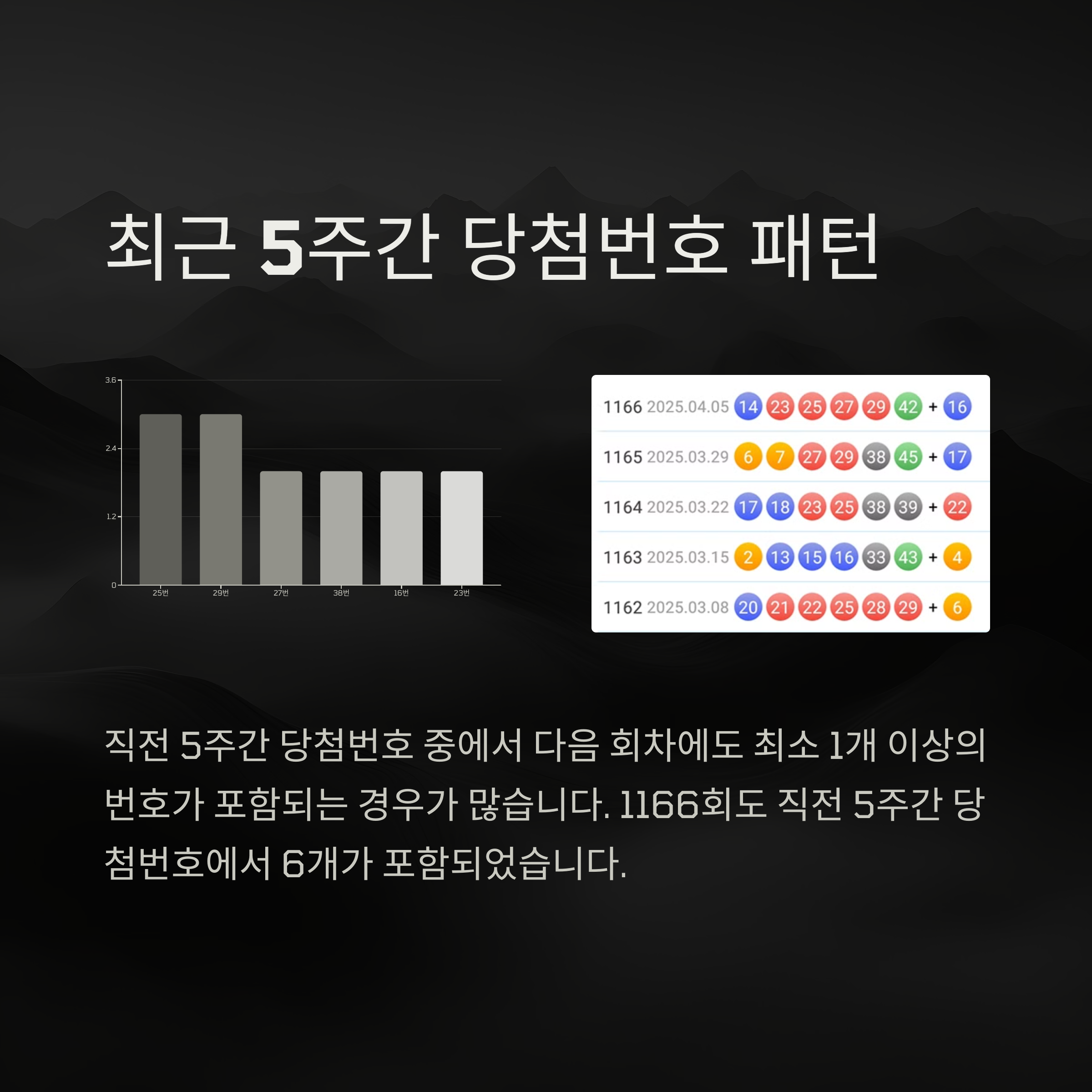 특히 주목해야 할 패턴은 직전 5주간 당첨번호 중에서 다음 회차에도 최소 1개 이상의 번호가 포함되는 경우가 많다는 점입니다. 1166회의 경우도 직전 5주간 당첨번호에서 6개가 포함되었습니다.