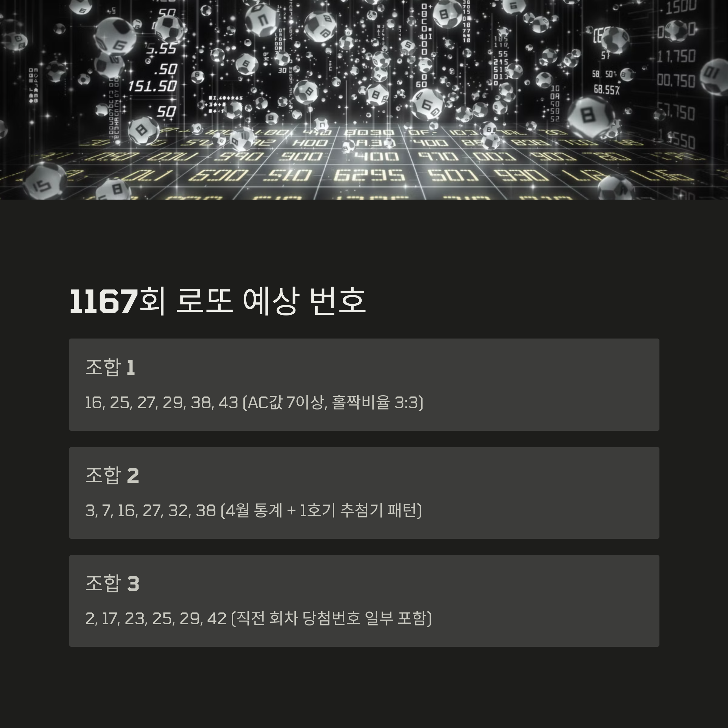 지금까지의 분석을 토대로 1167회 로또 예상번호를 제시하겠습니다. 최근 5주간 당첨번호와 4월 통계, 추첨기 패턴 등을 모두 고려했습니다.