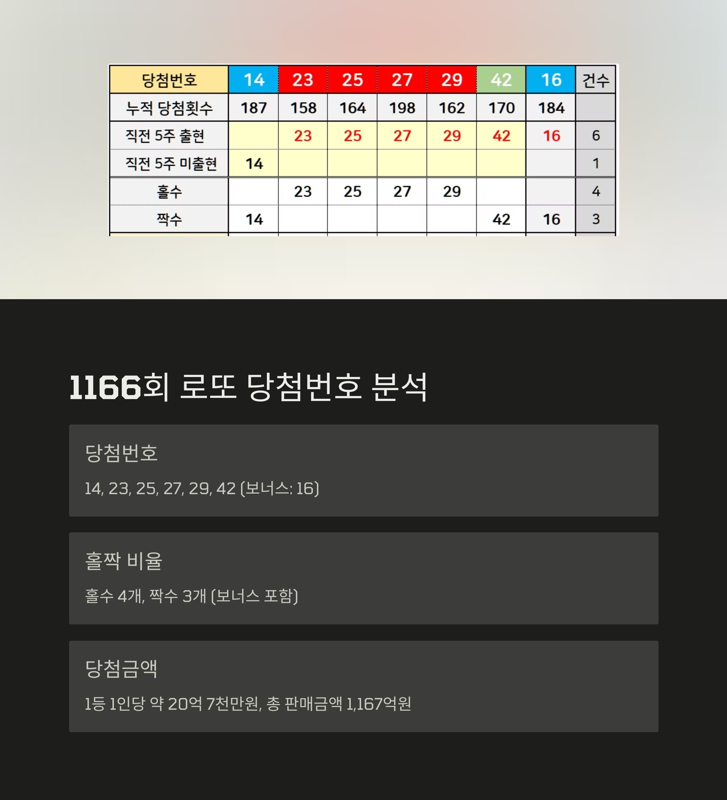 1166회 로또 당첨번호는 14, 23, 25, 27, 29, 42였으며, 보너스 번호는 16이었습니다. 이번 회차의 특징은 홀수와 짝수의 비율이 보너스 번호를 포함하여 홀수 4개, 짝수 3개로 구성되었다는 점입니다.