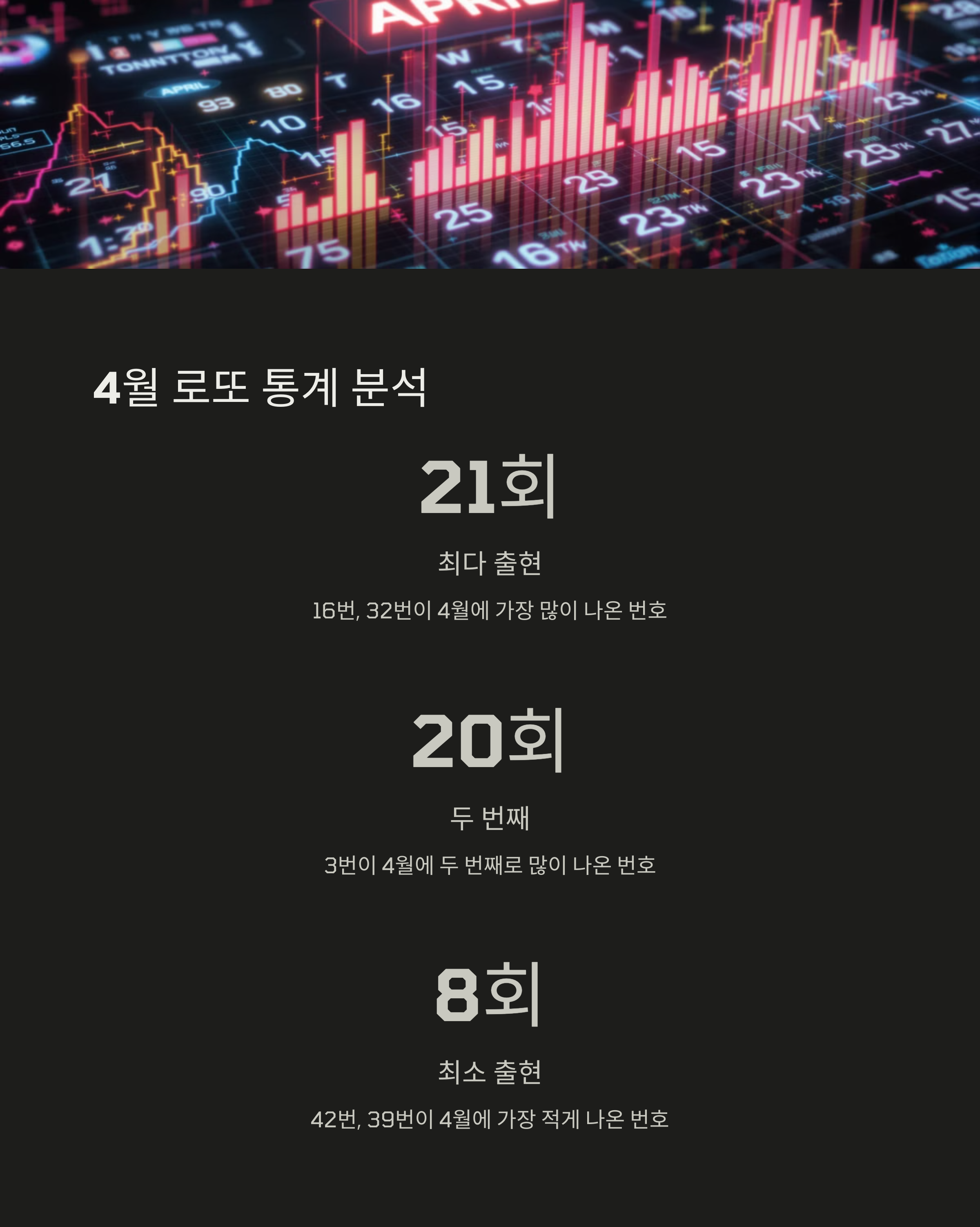 4월에 진행되는 로또 추첨에는 특별한 패턴이 있을까요? 2003년 4월부터 2024년 4월까지의 로또 통계에 따르면, 4월에 가장 많이 나온 번호는 16번과 32번(각 21회), 3번(20회), 4번, 26번, 36번(각 19회) 순입니다.