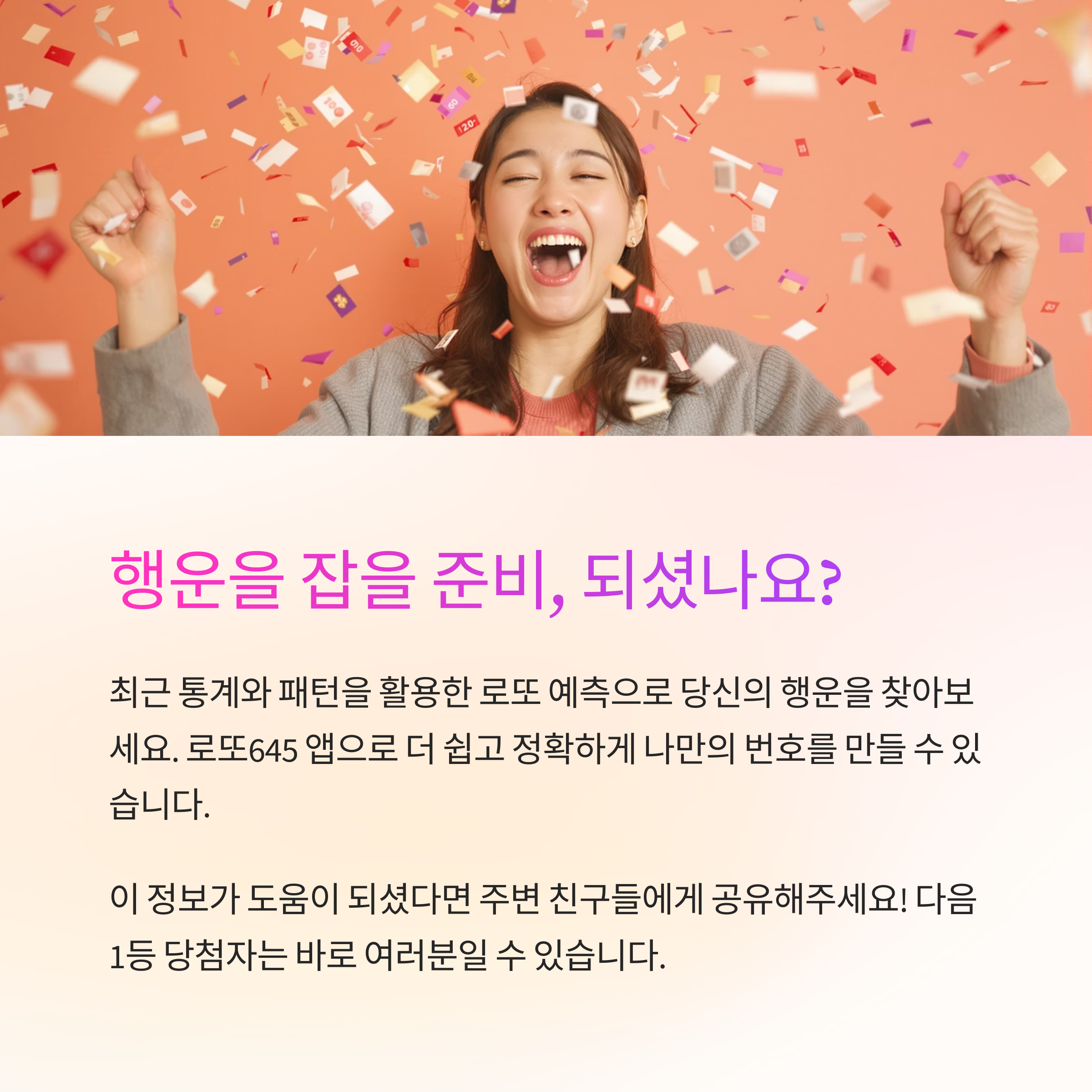 로또645 앱을 활용하면 "상세 조합 생성" 기능으로 고정수와 제외수를 설정해 나만의 로또 예상번호를 쉽게 만들 수 있습니다. 이번 분석에서는 최근 통계와 4월 특성을 고려한 예상번호를 소개하고, 로또645 앱으로 더 정확한 번호를 얻는 방법을 알려드리겠습니다.