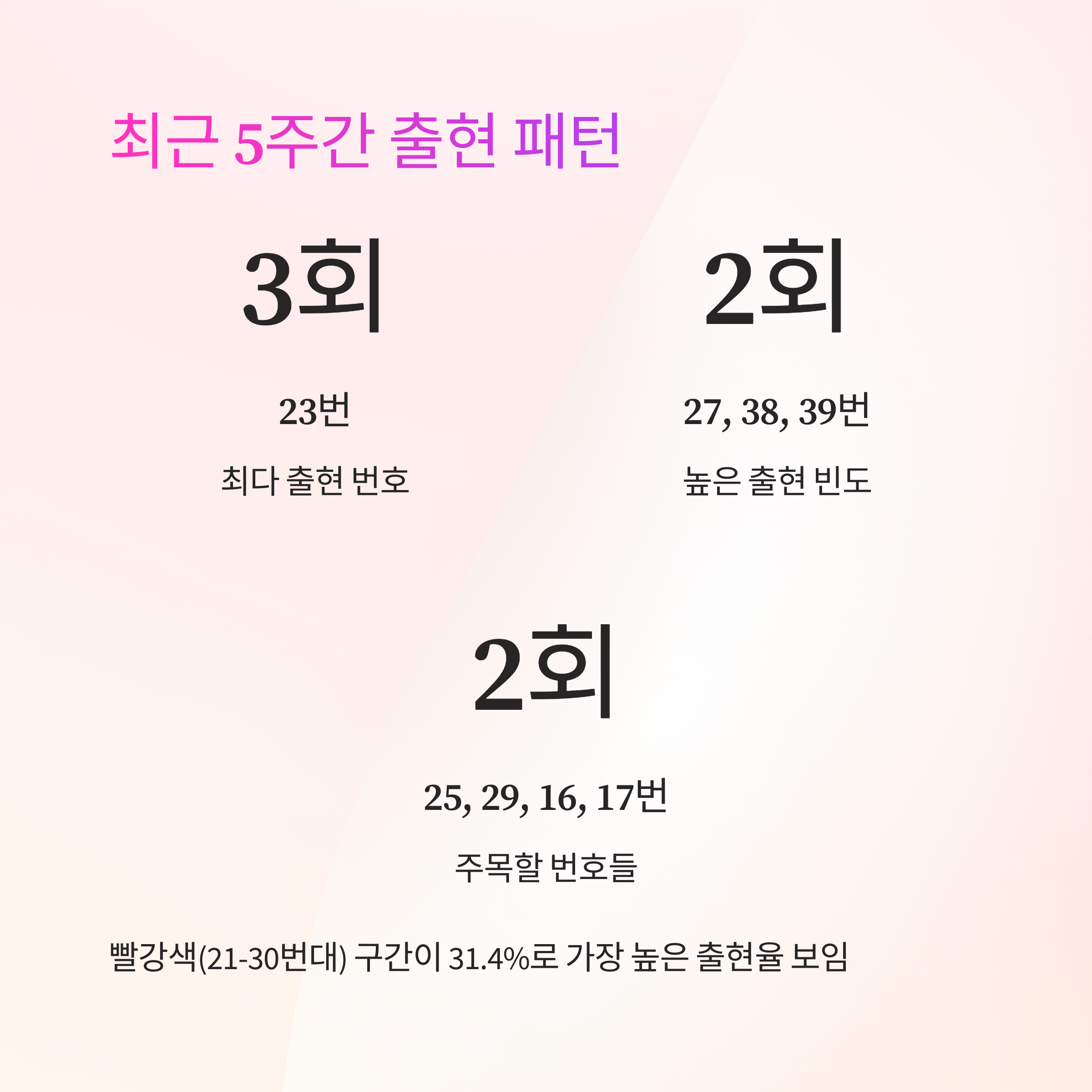최근 5주간 당첨번호를 분석해보면, 23번이 3회로 가장 많이 출현했고, 27번, 38번, 39번, 25번, 29번, 16번, 17번이 각 2회씩 출현했습니다.