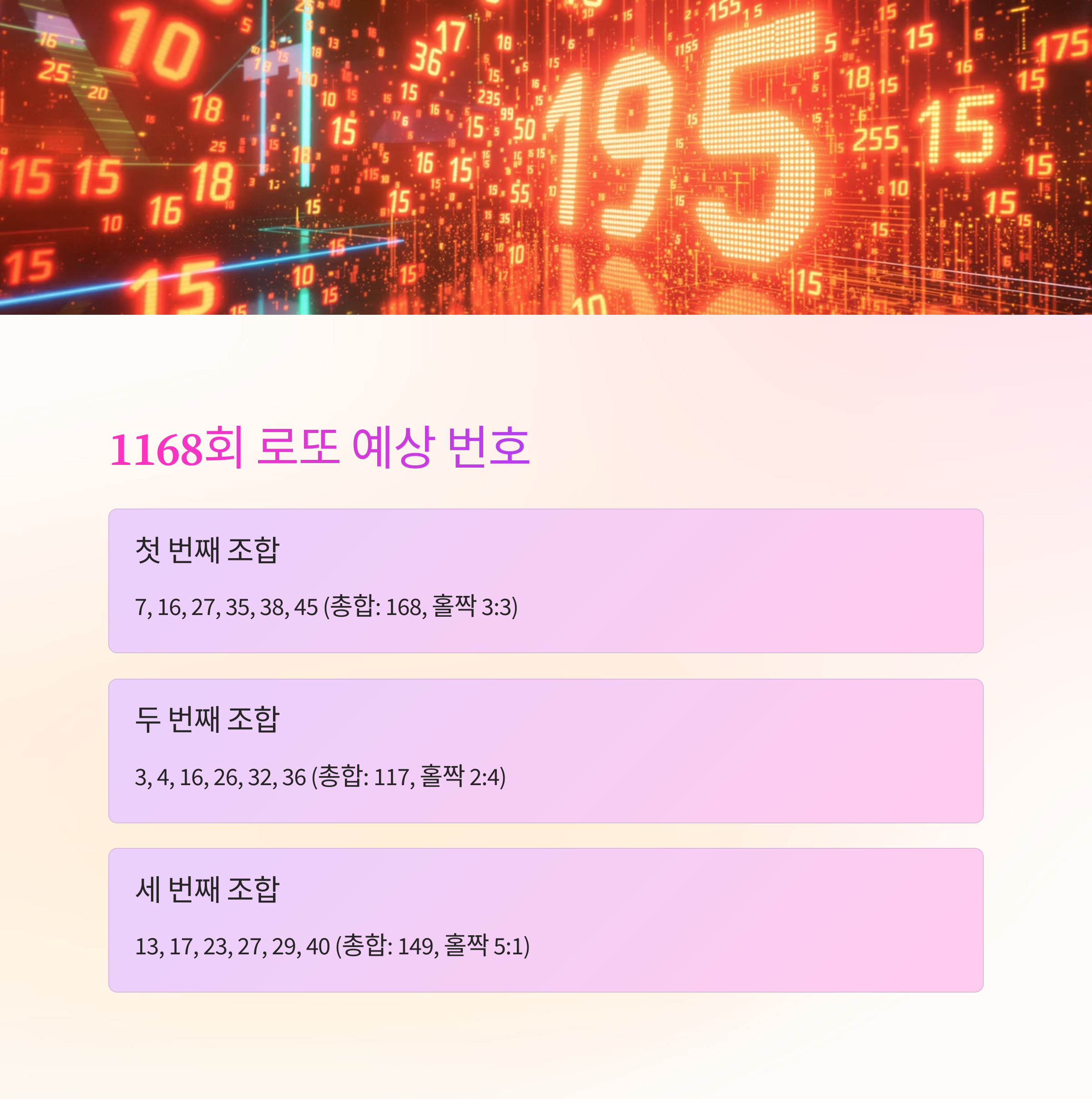 지금까지의 분석을 바탕으로 1168회 로또 예상 번호를 몇 가지 조합으로 제시해보겠습니다. 이 번호들은 통계 데이터와 다양한 분석 방법을 적용하여 선정되었습니다.