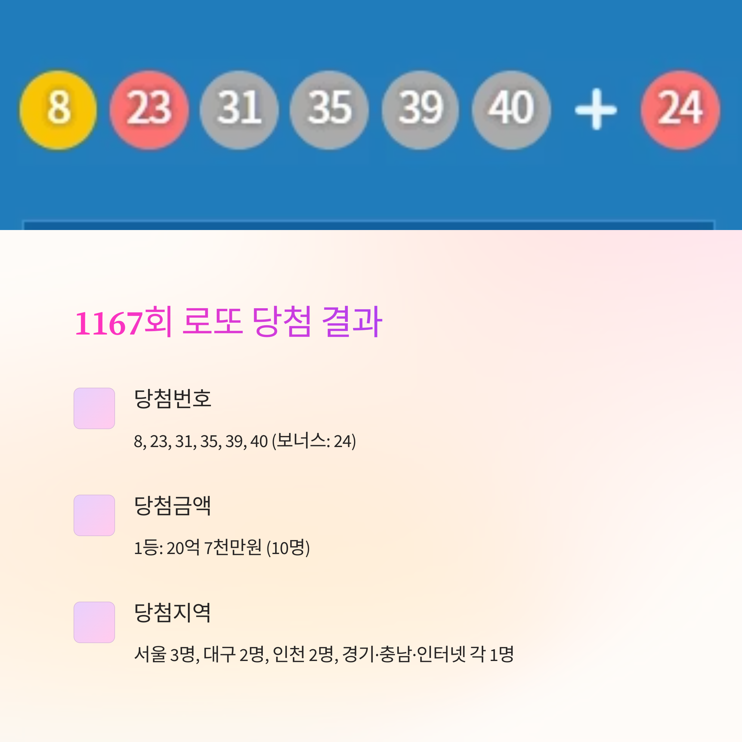 1167회 로또 당첨 결과는 많은 분들의 관심을 끌었습니다. 로또 1등 당첨번호는 8, 23, 31, 35, 39, 40이었으며, 보너스 번호는 24였습니다.