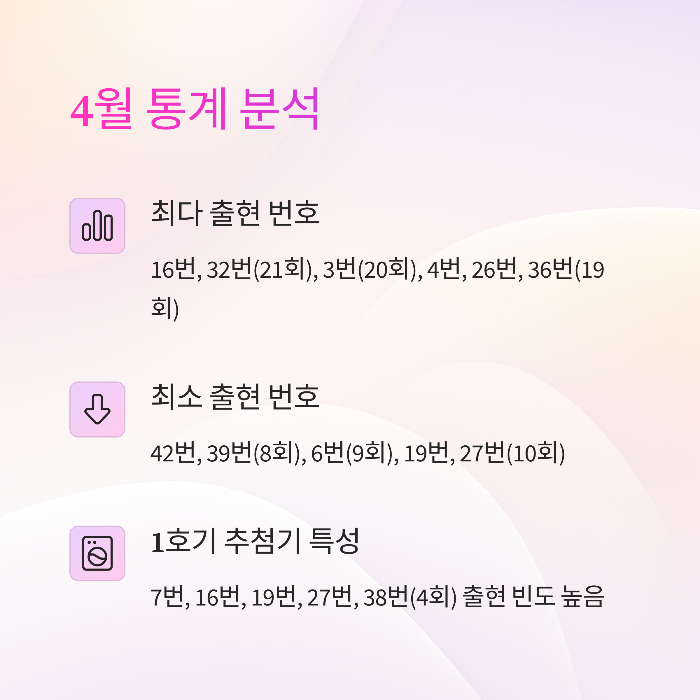 4월 통계를 중점적으로 반영했습니다. 3번(20회), 4번(19회), 26번(19회), 36번(19회), 32번(21회)은 모두 4월에 높은 출현 빈도를 보인 번호들입니다.