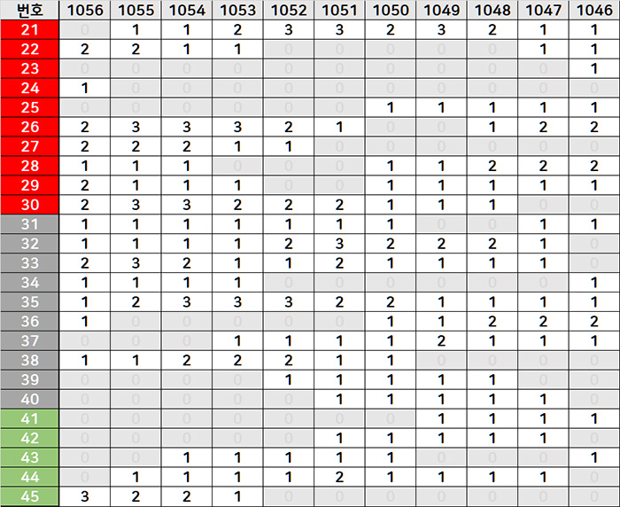 1056회 당첨번호까지 분석된 자료이지만, 다음 로또 예상번호를 유추하는데는 도움됩니다.