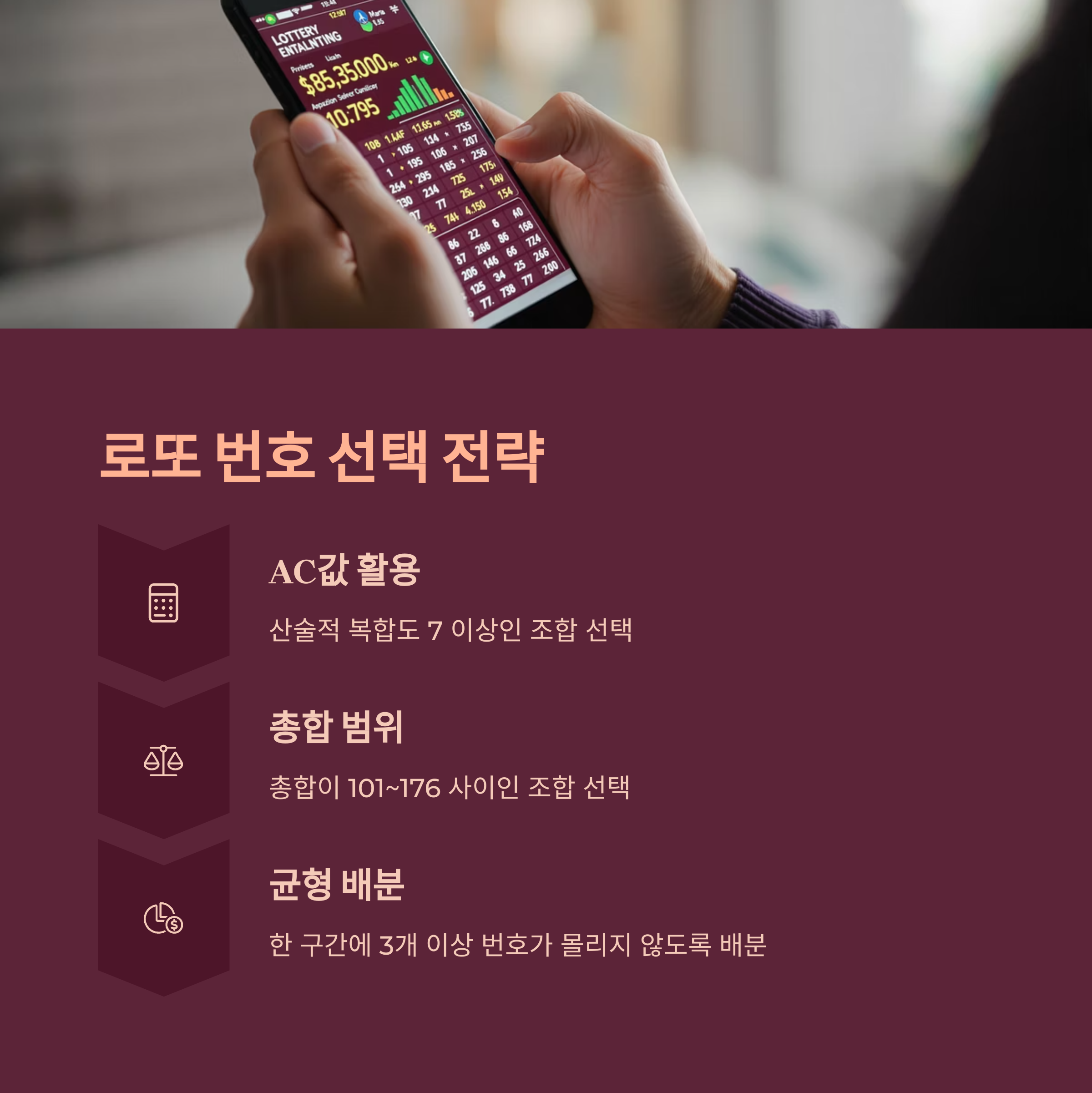 AC값(산술적 복합도)이 7 이상인 조합, 총합이 101~176 사이인 조합, 동일한 끝수가 0~3개 포함된 조합, 한 구간에 3개 이상 번호가 몰리지 않은 조합 등이 통계적으로 당첨 확률이 높다고 알려져 있습니다.