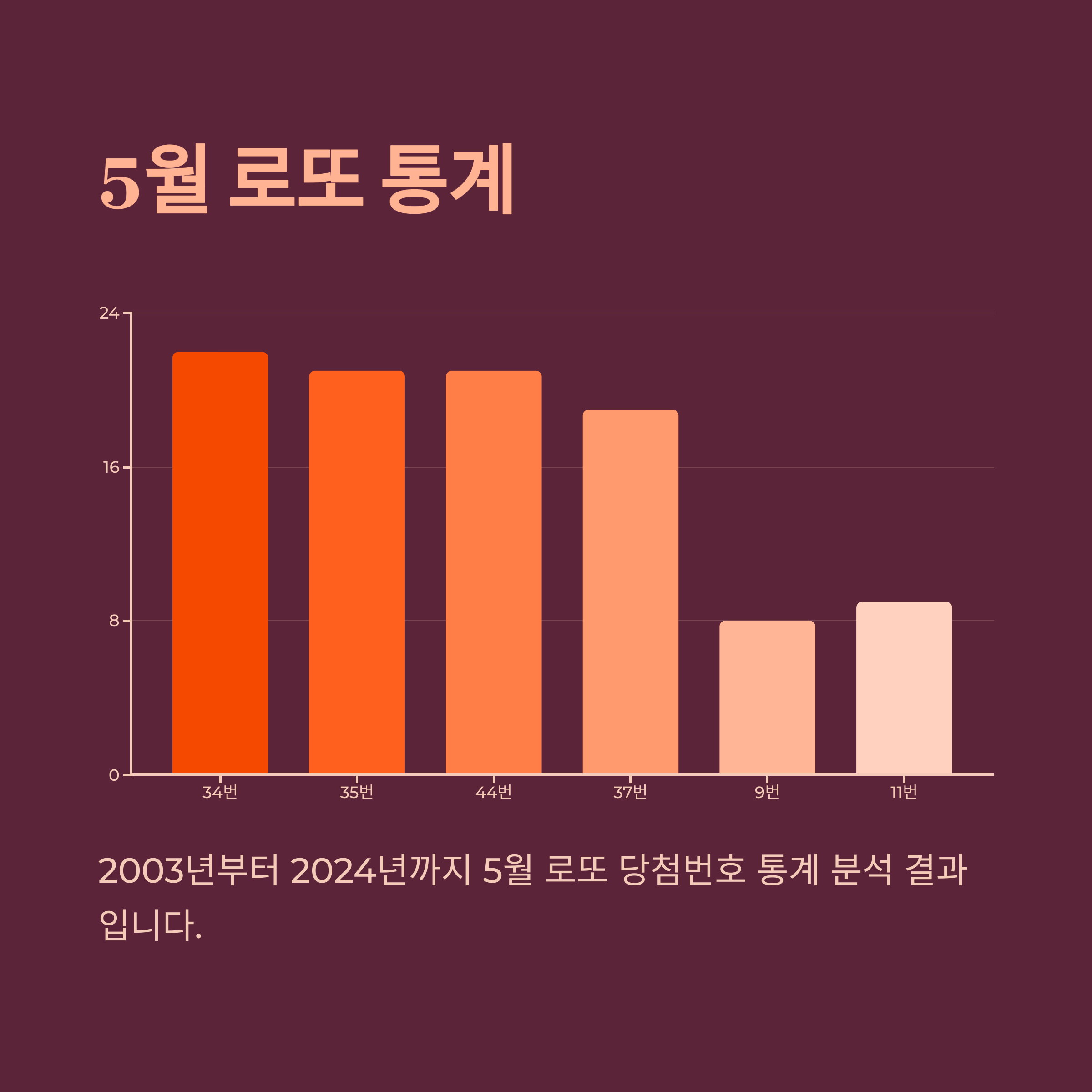 5월 로또 통계를 살펴보면 흥미로운 패턴이 발견됩니다. 2003년 5월부터 2024년 5월까지의 데이터를 분석한 결과, 5월에 가장 많이 출현한 번호는 34번(22회), 35번(21회), 44번(21회), 37번(19회), 18번(19회), 31번(19회), 28번(19회) 순입니다.