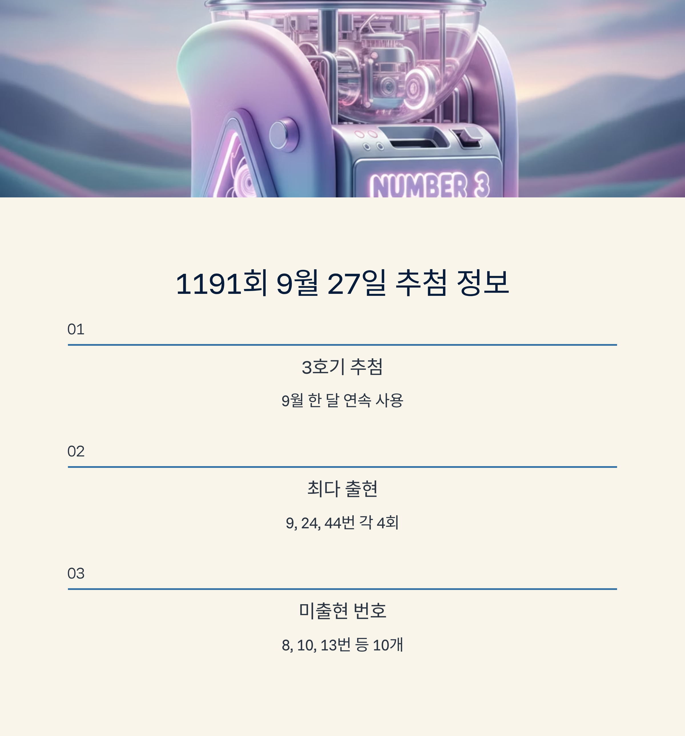 1191회 예상번호 선정 시에는 3호기의 특성과 9월 통계 패턴을 고려하는 것이 중요합니다. 최근 5주간 출현번호에서 4개 이상이 나올 가능성이 높으므로, 이를 반영한 번호 선택이 필요합니다.