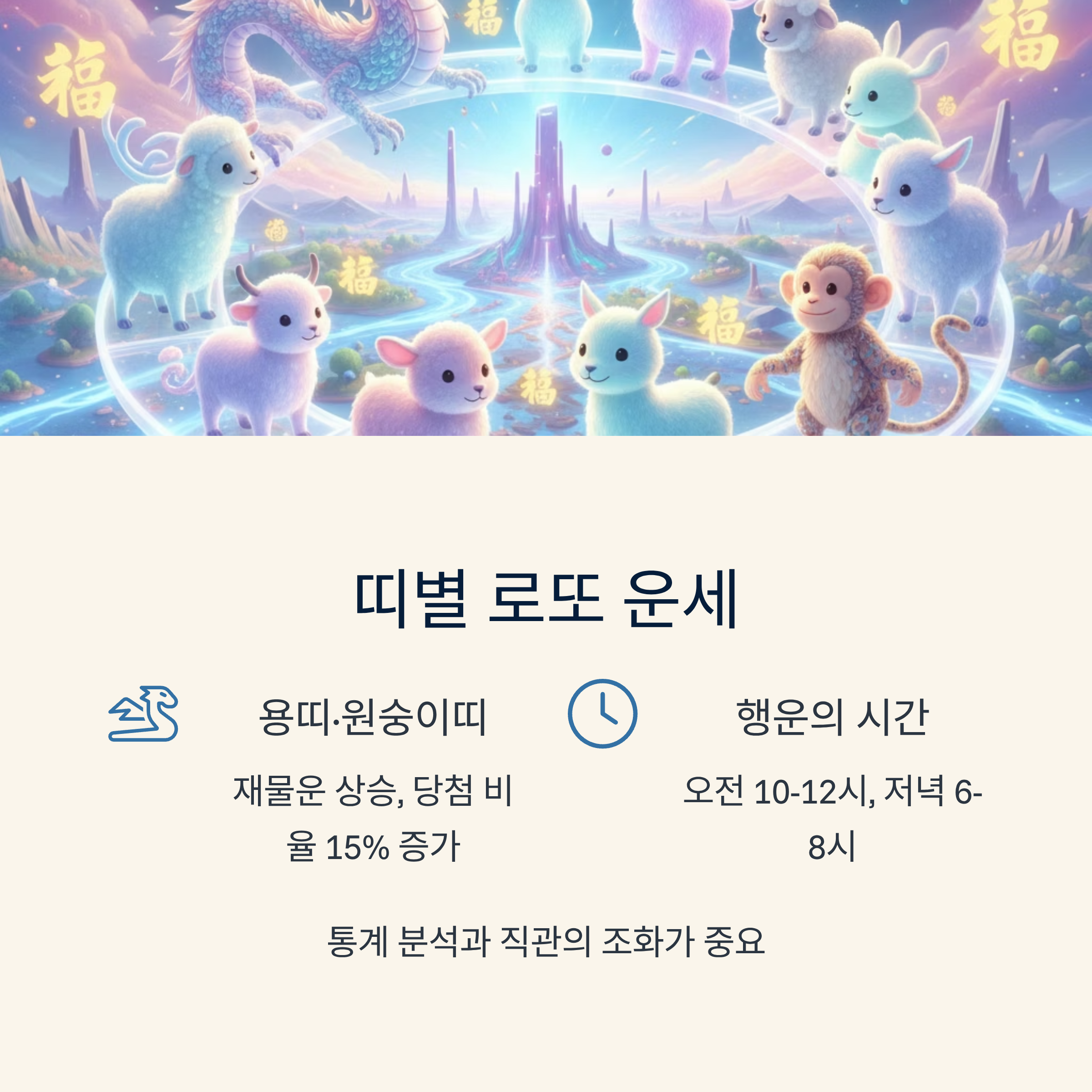 이번 주는 특히 용띠와 원숭이띠의 재물운이 상승세를 보일 것으로 예상됩니다. 최근 5주간 당첨자 분포를 보면 이 두 띠의 당첨 비율이 평균보다 15% 높게 나타났습니다.