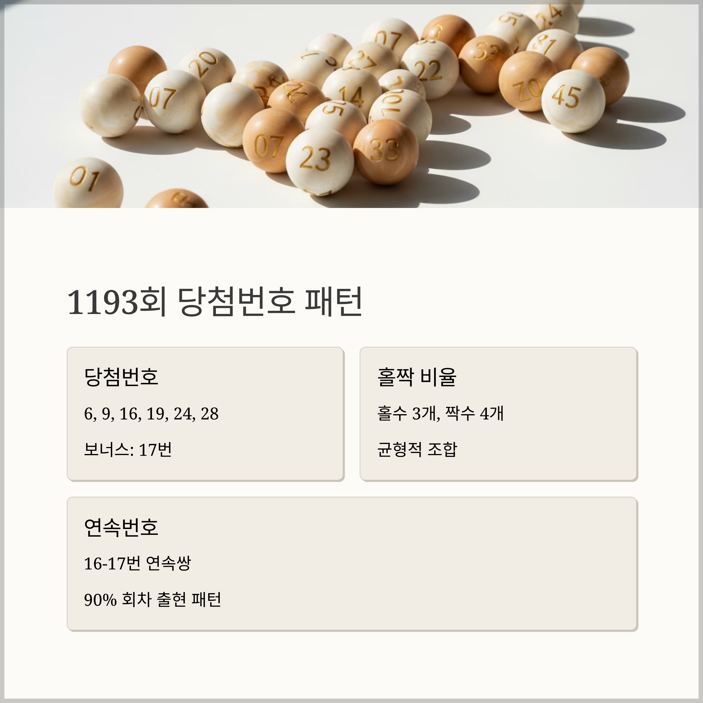 1193회 로또 당첨번호 6, 9, 16, 19, 24, 28번과 보너스 번호 17번은 흥미로운 패턴을 보여줍니다.
