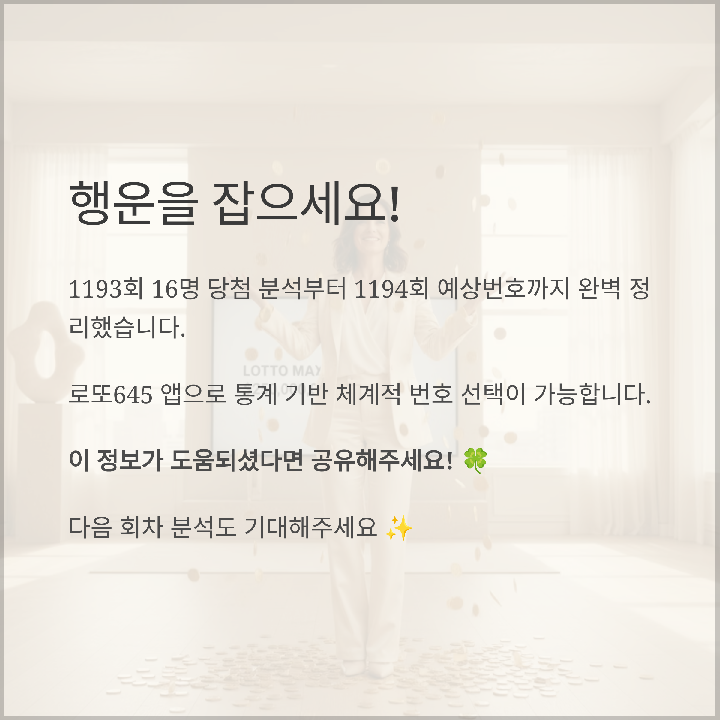 이제 많은 분들이 1194회 10월 18일 로또번호에 관심을 가지고 계실 것입니다. 1194회 로또 제외수 설정부터 1194회 로또 예상번호 도출까지, 체계적인 분석 방법을 통해 여러분의 번호 선택을 도와드리겠습니다. 나의 로또 운세와 띠별 운세 분석, 그리고 로또 1등 당첨번호 자동 무료 추천 로또645 앱 활용법까지 상세히 안내해드립니다.