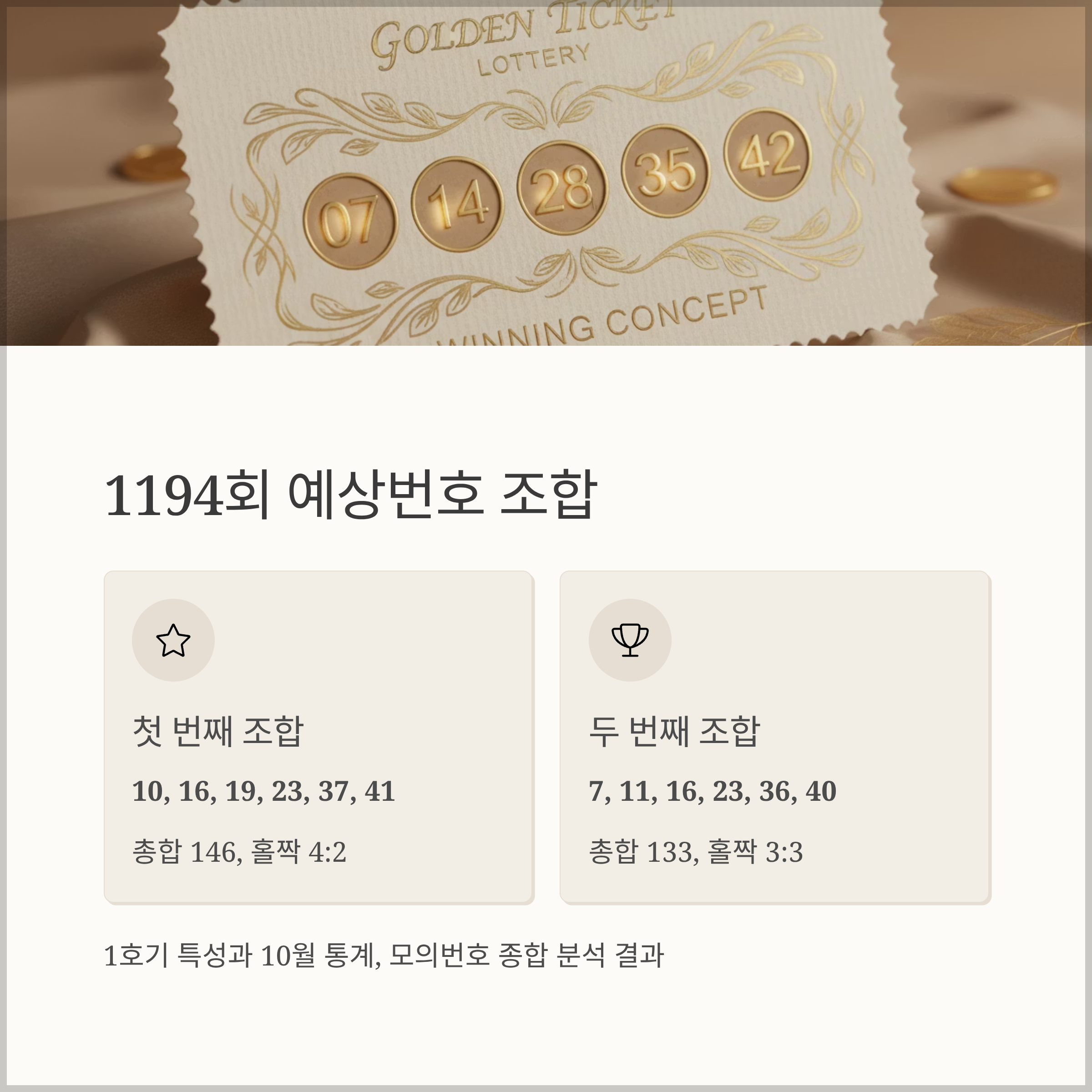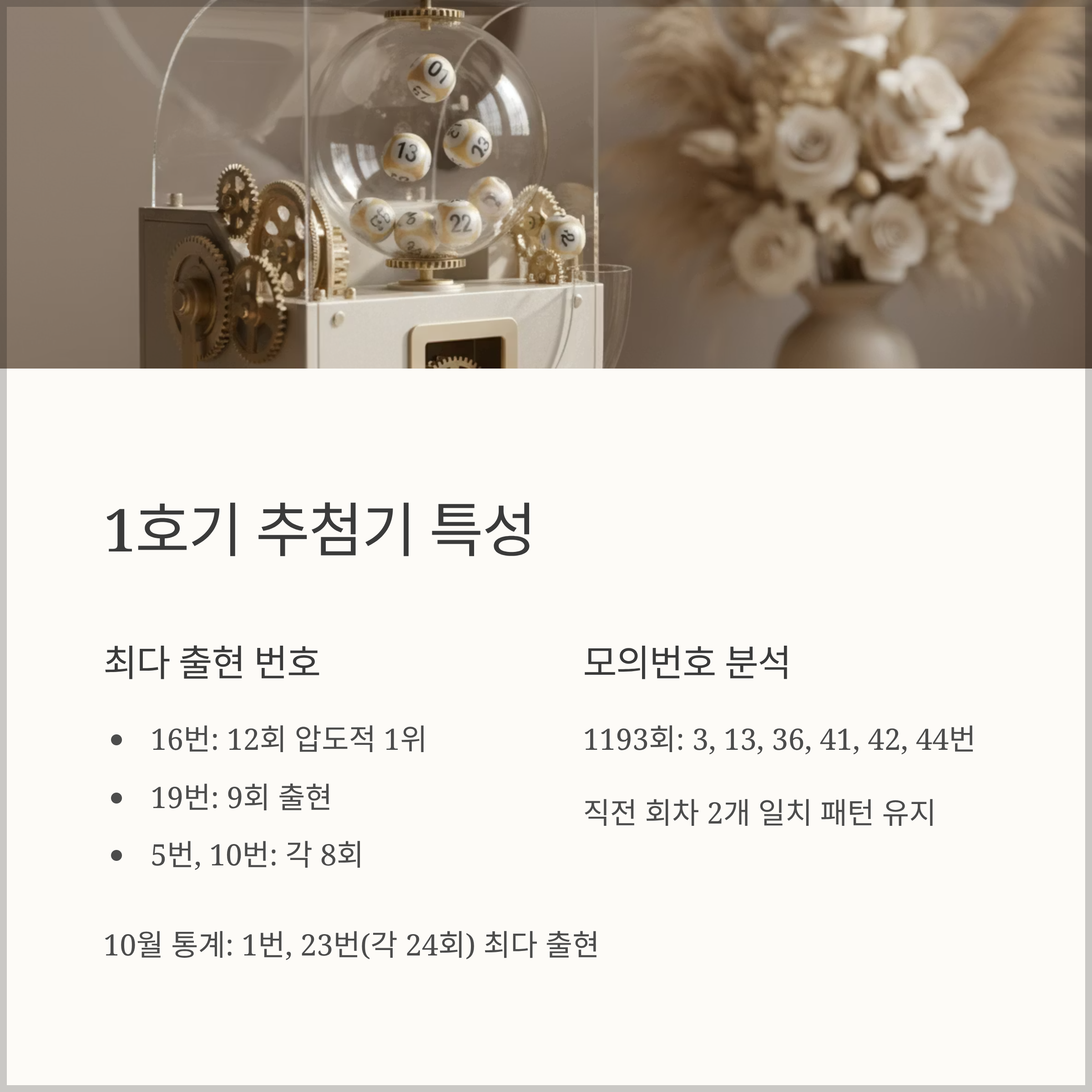 1194회 예상번호 분석에서는 1호기 추첨기의 특성과 10월 계절 통계, 최근 5주간 출현 패턴을 종합적으로 고려했습니다.