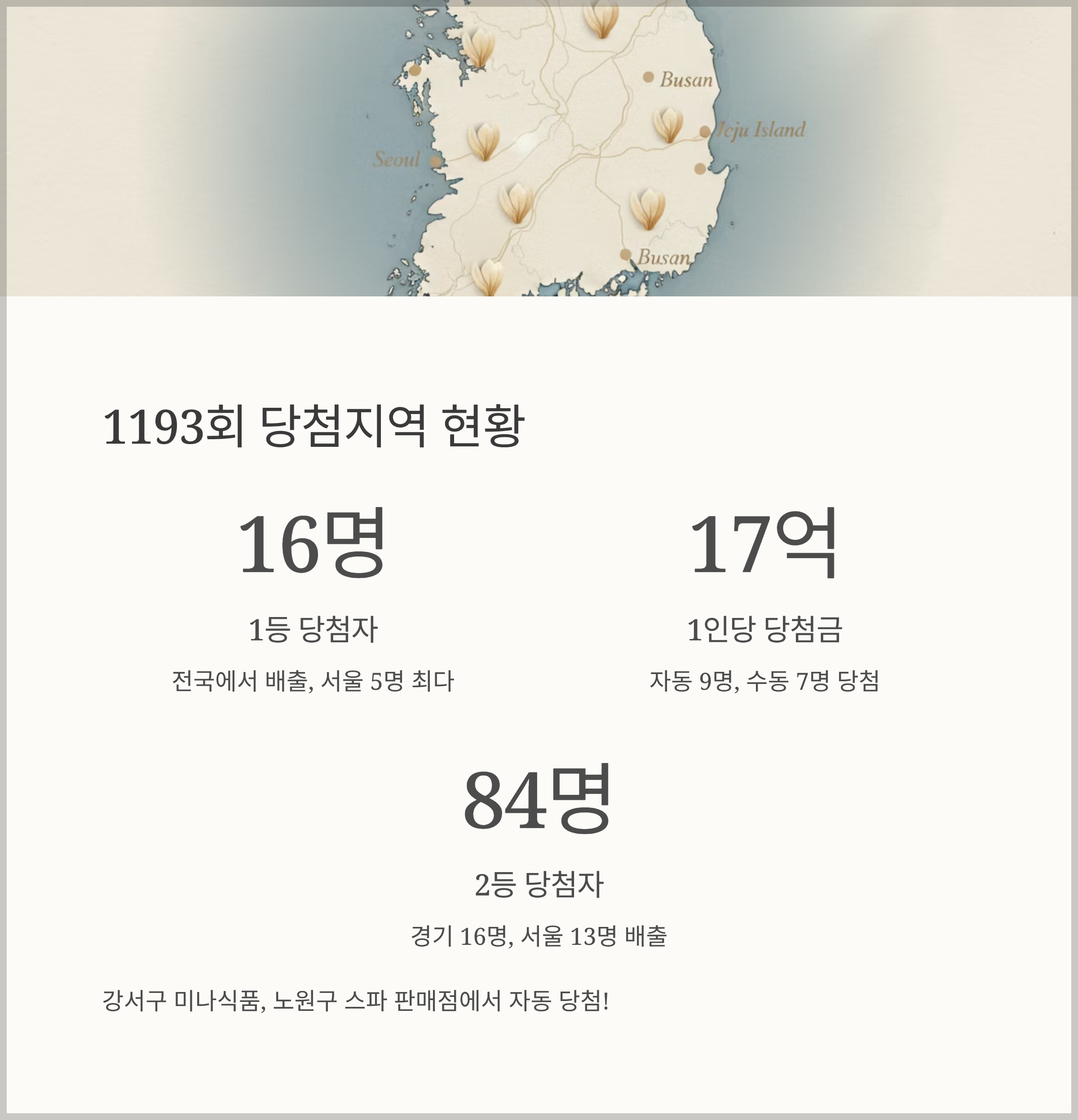 1193회 로또 1등 2등 당첨지역이 공개되면서 전국적으로 큰 관심을 모았습니다. 이번 회차에서는 총 16명의 1등 당첨자가 탄생했으며, 서울에서만 5명이 배출되어 가장 많은 당첨자를 기록했습니다. 1193회 주택 복권 당첨번호는 6, 9, 16, 19, 24, 28번이었고, 보너스 번호는 17번으로 확인되었습니다.