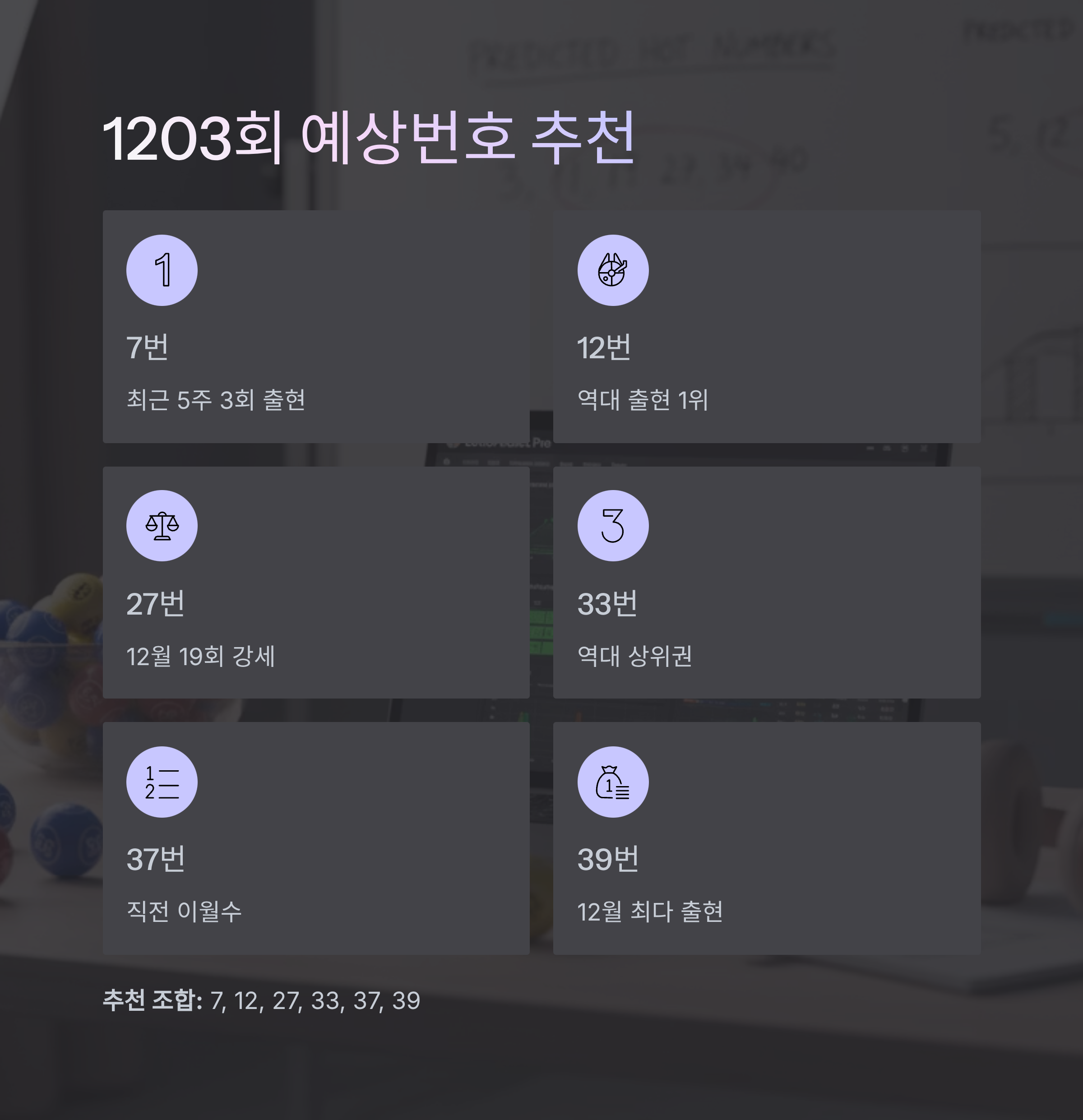 1203회 나눔로또 예상번호로 7번 12번 27번 33번 37번 39번 조합을 제안드렸지만, 실제로는 앱의 후보번호 받기 기능을 활용하시면 더 개인화된 번호를 받으실 수 있습니다.