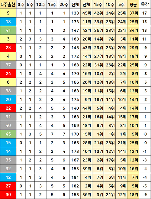 로또번호 분석에 사용할 자료들은 최근 5주 기간에 나왔던 로또 당첨 번호를 기준으로 정리하였고, 자료 정렬은 15주 순위에서 5주 순위로 증가한 값을 기준으로 정렬하였습니다.
