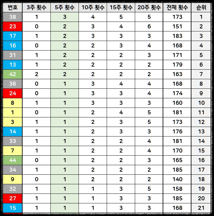 위 5주 출현번호 자료에서 가장 많이 당첨된 숫자는 38번이고 5주 동안 3회 당첨되었습니다.