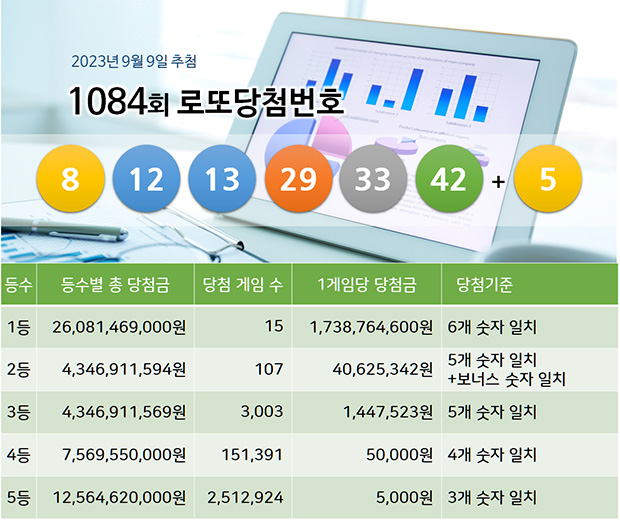 지난 로또 1084회 당첨번호 추첨결과와 등수별 당첨금, 인원수 내역입니다.