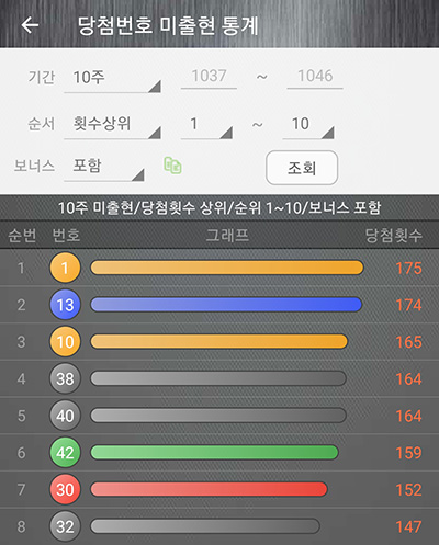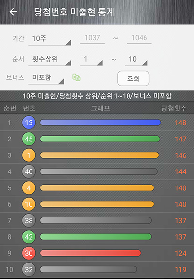 총 10개 미출현 번호가 확인되었고, 보너스 포함여부에 따라 미출현 결과가 이렇게 다르군요.