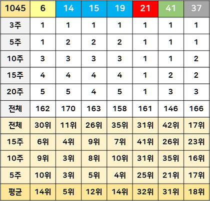 1045회차 로또 1등 당첨번호 7개에 대한 당첨횟수, 순위 자료입니다.
