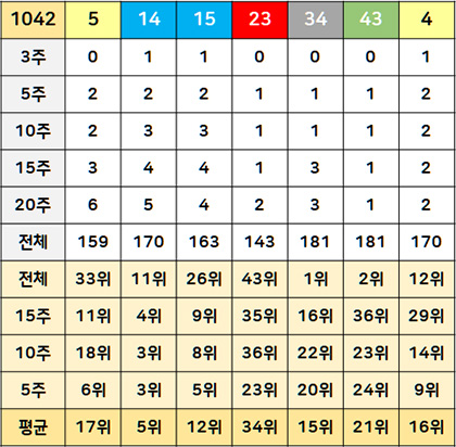 1043회, 1042회 로또 당첨 번호에 대한 기간별 당첨횟수와 당첨 순위 정보 입니다.