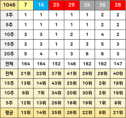 1046회 로또 1등 당첨번호 7개에 대하여 3주 5주 10주 15주 20주 전체 기간 당첨 횟수 자료가 우선 표시되고 있습니다.
