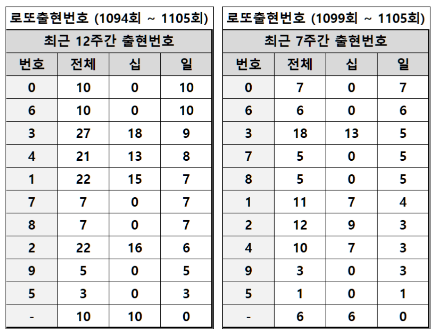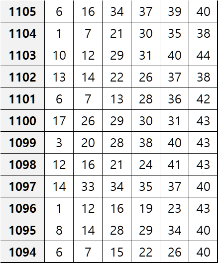 이번주 로또 예상번호는 12주 7주 동안 일의자리에 많이 나온 숫자를 사용해서 로또번호를 선별합니다. 1094회 ~ 1105회까지 로또 1등 번호입니다.