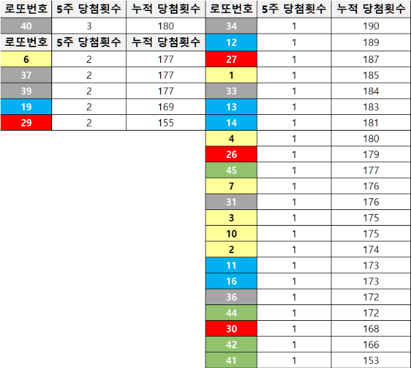 현재 15주 당첨횟수로 정렬한 분석표를 공개합니다.