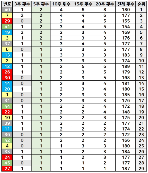 5주간 출현번호와 미출현 번호 내역입니다. 5주 당첨횟수로 정렬되어 있습니다.