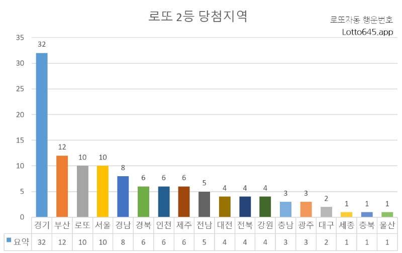 2등 당첨자는 모두 118명이 배출되었습니다. 경기 지역에서 32명이 나왔고, 부산에서 12명, 서울 지역에서 10명이 당첨되어 최다 당첨지역으로 확인됩니다.