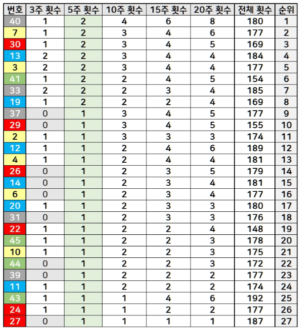 또한, 최근 5주간 당첨 번호 중 43, 45와 같은 고번호대의 출현 빈도가 높아, 고번호대에 대한 주의가 필요함을 알 수 있습니다.