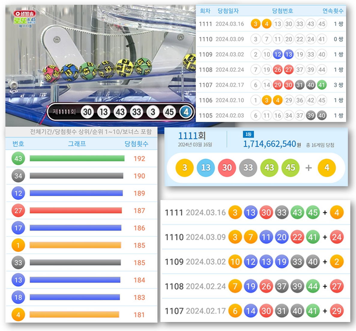 | 1111회 로또 예상번호 3월 16일 이번주 로또 당첨 번호 예측, 모의 추첨번호 5주간 최다 추첨기 출현 분석 (0) | 2024.03.14 |