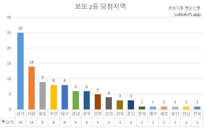 경기 지역에서 25명 나왔고, 서울에서 14명, 인터넷복권판매사이트에서 9명, 부산 대구에서 각각 8명씩 최다 2등 당첨자가 나왔습니다.