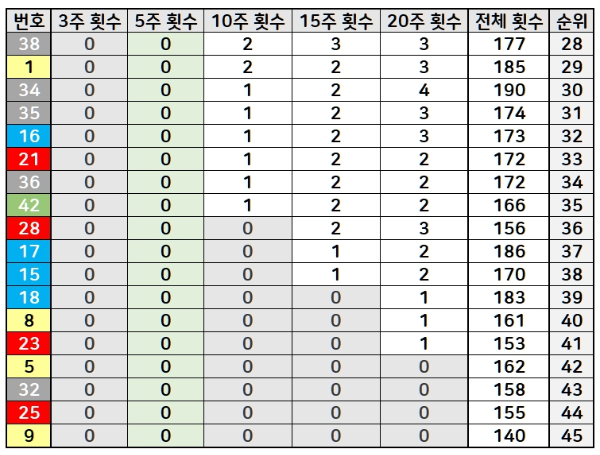 제외수로는 최근 5주간 미출현 번호인 38, 1, 34와 같은 번호를 고려할 수 있습니다.
