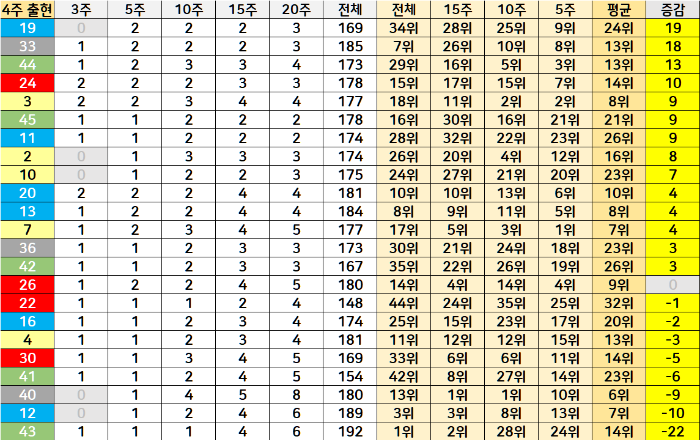 4주간 당첨번호 분석표를 기준으로 설명드리면, 각 번호들이 기간별로 당첨된 횟수와 출현 순위를 계산하고 있습니다.