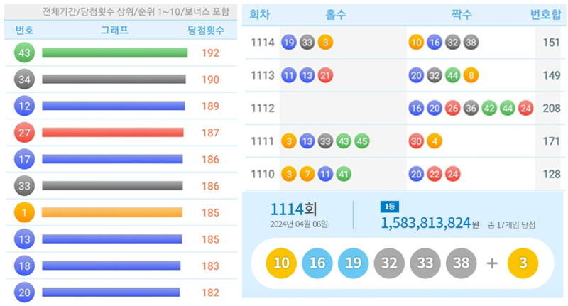 1114회차 당첨번호는 10, 16, 19, 32, 33, 38이었고, 보너스 번호는 3이었습니다. 이번 회차에 주목할 만한 몇 가지 특징은 다음과 같습니다.