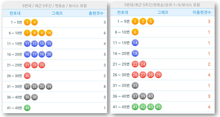 최근 5주간 나왔던 로또복권 당첨번호를 분석하여 고정수 제외수를 결정할 수 있습니다.