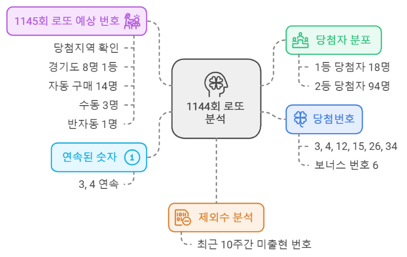 나의 로또 운세를 살펴보면 흥미로운 점이 있는데요, 1144회 당첨번호는 3, 4, 12, 15, 26, 34였고 보너스 번호는 6이었어요. 여기서 연속된 숫자 3, 4가 함께 당첨된 점이 특별했죠. 또한 1145회 로또 제외수를 찾아보니 최근 10주간 한 번도 출현하지 않은 번호들이 있어 이를 분석에 반영했어요.