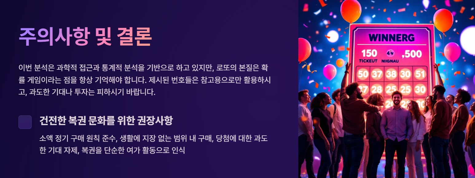 이번 분석은 과학적 접근과 통계적 분석을 기반으로 하고 있지만, 로또의 본질은 확률 게임이라는 점을 항상 기억해야 합니다. 제시된 번호들은 참고용으로만 활용하시고, 과도한 기대나 도전은 피하시기 바랍니다.