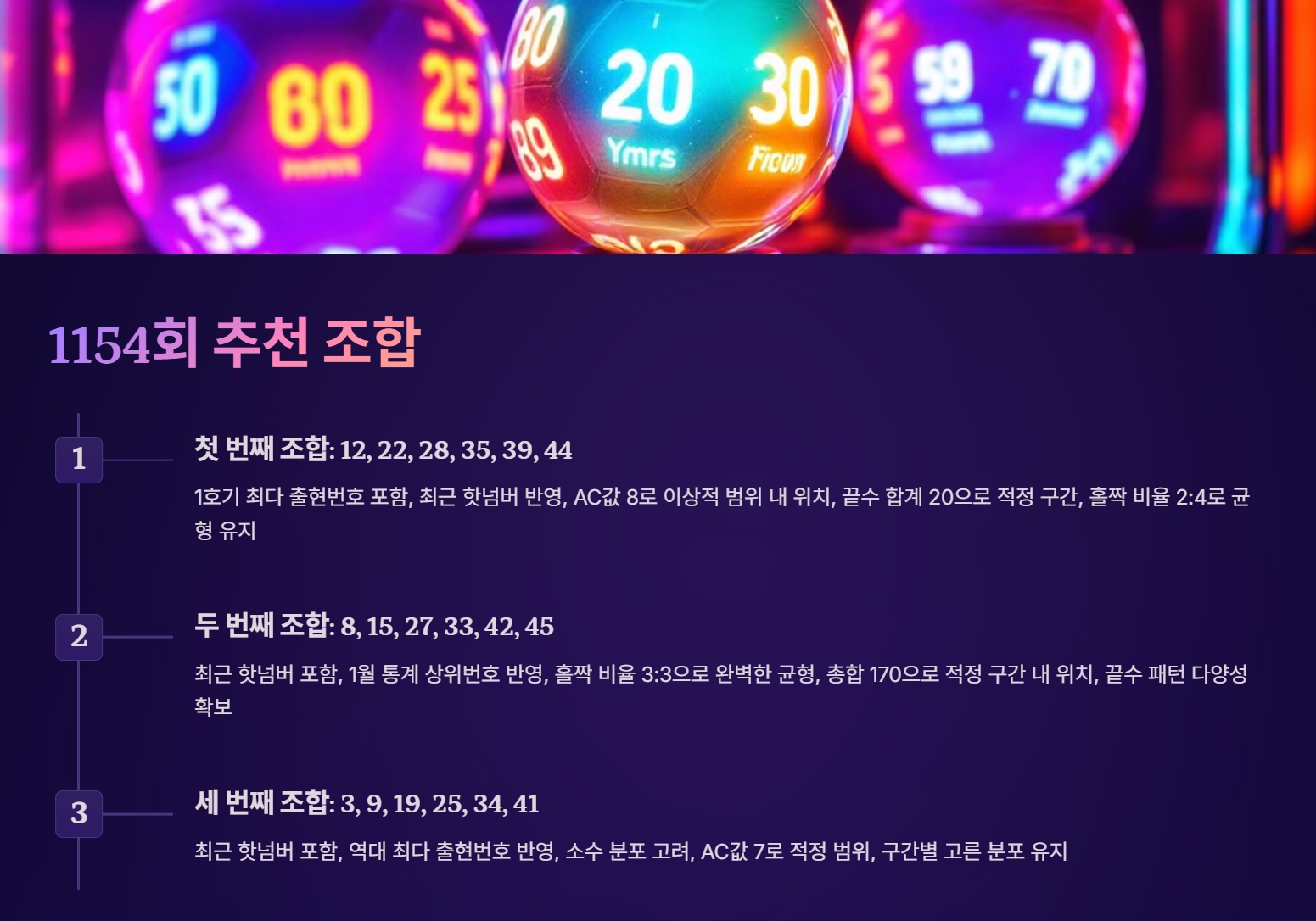 매주 토요일 저녁, 수많은 사람들의 기대를 한 몸에 받는 로또 추첨. 이번 1154회 로또 번호 분석은 빅데이터와 통계적 접근을 통해 보다 체계적인 예측을 시도했습니다. 물론 로또의 특성상 완벽한 예측은 불가능하지만, 확률적으로 의미 있는 패턴을 찾아보고자 했습니다.