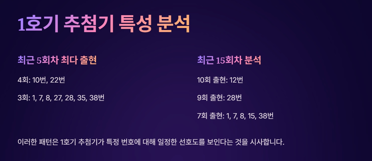 이러한 패턴은 1호기 추첨기가 특정 번호에 대해 일정한 선호도를 보인다는 것을 시사합니다.